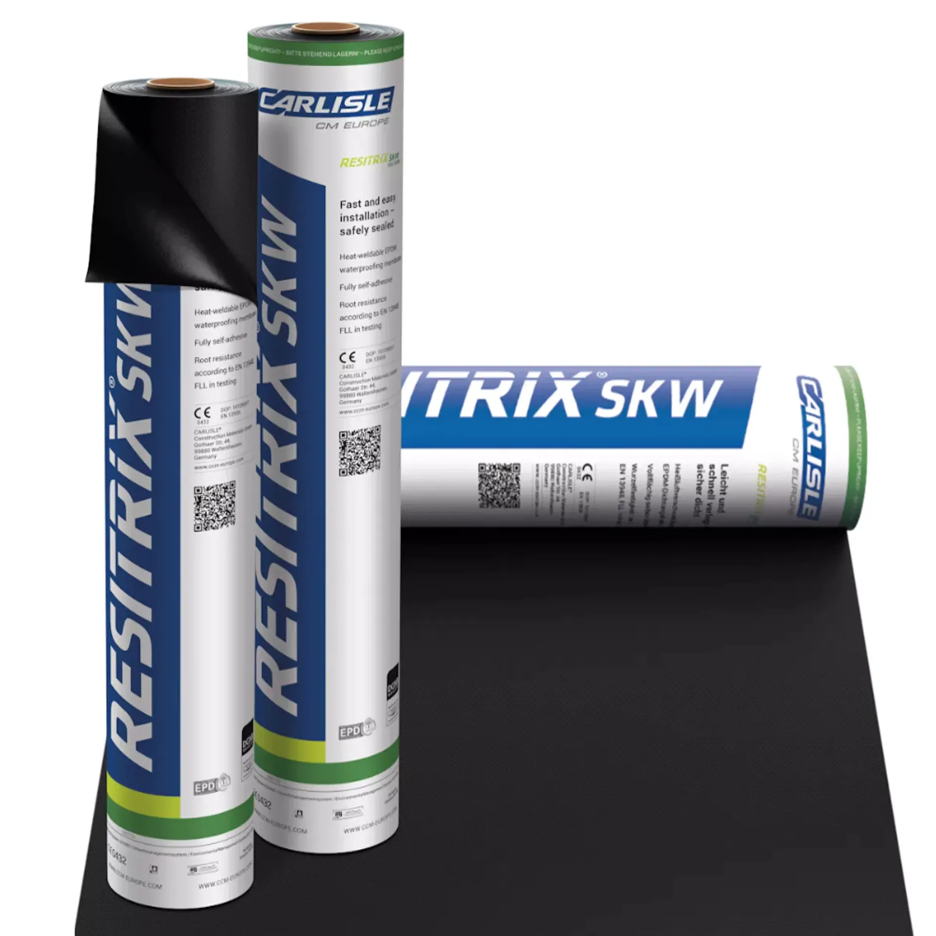 RESITRIX® vereint als einzige Abdichtungsbahn die Vorteile des Synthesekautschuks EPDM und von hochwertigem polymermodifiziertem Bitumen. Dank der unterseitigen Polymerbitumenschicht lässt sich das Material auf nahezu alle Untergründe verlegen und einfach, schnell und sicher mit einem Heißluftgerät ohne offene Flamme verschweißen. Das unabhängige Prüfinstitut Süddeutsches Kunststoff Zentrum (SKZ) bescheinigt RESITRIX® eine Nutzungsdauer von über 50 Jahren, - als einzigem Produkt überhaupt auch für die Nahtfügung.